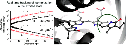 Photoisomerization of a protein bound chromophore is the basis of the light sensing and signaling responses of many photoreceptors. Z-to-E photoisomerization of the Pr Cph1?2 phytochrome has been investigated by polarization resolved femtosecond visible pump-infrared probe spectroscopy, which yields structural information on the Pr excited state (Pr*), Pr ground state, and lumi-R product state. By exhaustive search analysis two photoreaction time constants of (4.7±1.4) ps and (30±5) ps were found. Ring D orientational change in the electronic excited state to the transition state (90° twist) has been followed in real-time. Rotation of ring D takes place in the electronically excited state with a time constant of 30±5 ps. The photoisomerization is best explained by a single rotation around C15=C16 methine bridge in the Pr* state and diffusive interaction with its protein surrounding.