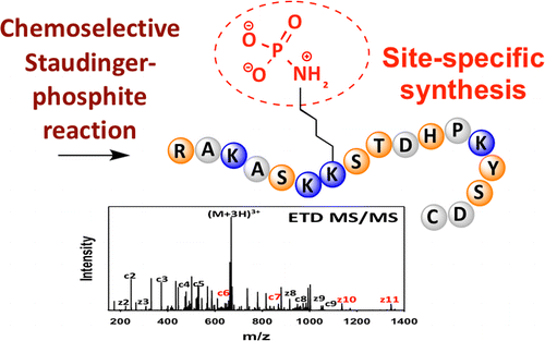 Protein phosphorylation controls major processes in cells. Although phosphorylation of serine, threonine, and tyrosine and also recently histidine and arginine are well-established, the extent and biological significance of lysine phosphorylation has remained elusive. Research in this area has been particularly limited by the inaccessibility of peptides and proteins that are phosphorylated at specific lysine residues, which are incompatible with solid-phase peptide synthesis (SPPS) due to the intrinsic acid lability of the P(?O)-N phosphoramidate bond. To address this issue, we have developed a new synthetic route for the synthesis of site-specifically phospholysine (pLys)-containing peptides by employing the chemoselectivity of the Staudinger-phosphite reaction. Our synthetic approach relies on the SPPS of unprotected e-azido lysine-containing peptides and their subsequent reaction to phosphoramidates with phosphite esters before they are converted into the natural modification via UV irradiation or basic deprotection. With these peptides in hand, we demonstrate that electron-transfer dissociation tandem mass spectrometry can be used for unambiguous assignment of phosphorylated-lysine residues within histone peptides and that these peptides can be detected in cell lysates using a bottom-up proteomic approach. This new tagging method is expected to be an essential tool for evaluating the biological relevance of lysine phosphorylation.