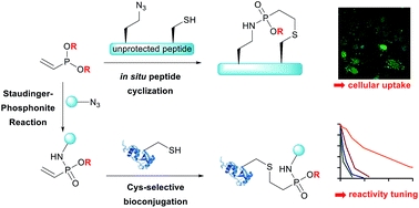 In this paper, we introduce vinylphosphonites for chemoselective Staudinger-phosphonite reactions (SPhR) with azides to form vinylphosphonamidates for the subsequent modification of cysteine residues in peptides and proteins. An electron-rich alkene is turned into an electron-deficient vinylphosphonamidate, thereby inducing electrophilic reactivity for a following thiol addition. We show that by varying the phosphonamidate ester substituent we can fine-tune the reactivity of the thiol addition and even control the functional properties of the final conjugate. Furthermore, we observed a drastic increase in thiol addition efficiency when the SPhR is carried out in the presence of a thiol substrate in a one-pot reaction. Hence, we utilize vinylphosphonites for the chemoselective intramolecular cyclization of peptides carrying an azide-containing amino acid and a cysteine in high yields. Our concept was demonstrated for the stapling of a cell-permeable peptidic inhibitor for protein–protein interaction (PPI) between BCL9 and beta-catenin, which is known to create a transcription factor complex playing a role in embryonic development and cancer origin, and for macrocyclization of cell-penetrating peptides (CPPs) to enhance the cellular uptake of proteins.