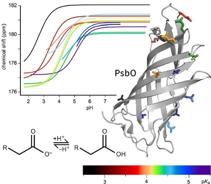 Photosystem II (PSII) catalyzes the splitting of water, releasing protons and dioxygen. Its highly conserved subunit PsbO extends from the oxygen evolving center (OEC) into the thylakoid lumen and stabilizes the catalytic Mn 4 CaO 5 -cluster. The high conservation of accessible, negatively charged surface residues in PsbO suggests additional functions, as local pH buffer or by affecting the flow of protons. For this discussion, we provide an experimental basis by determining pK a values of water-accessible aspartate and glutamate side chain carboxyl groups using NMR. Their distribution is strikingly uneven, with high pK a values around 4.9 clustering on the luminal PsbO side and values below 3.5 on the side facing PSII. pH-dependent changes of backbone chemical shifts in the area of the lumen-exposed loops are observed, indicating conformational changes. In conclusion, we present a site-specific analysis of carboxyl group proton affinites in PsbO, providing a basis to further understand proton transport in photosynthesis.